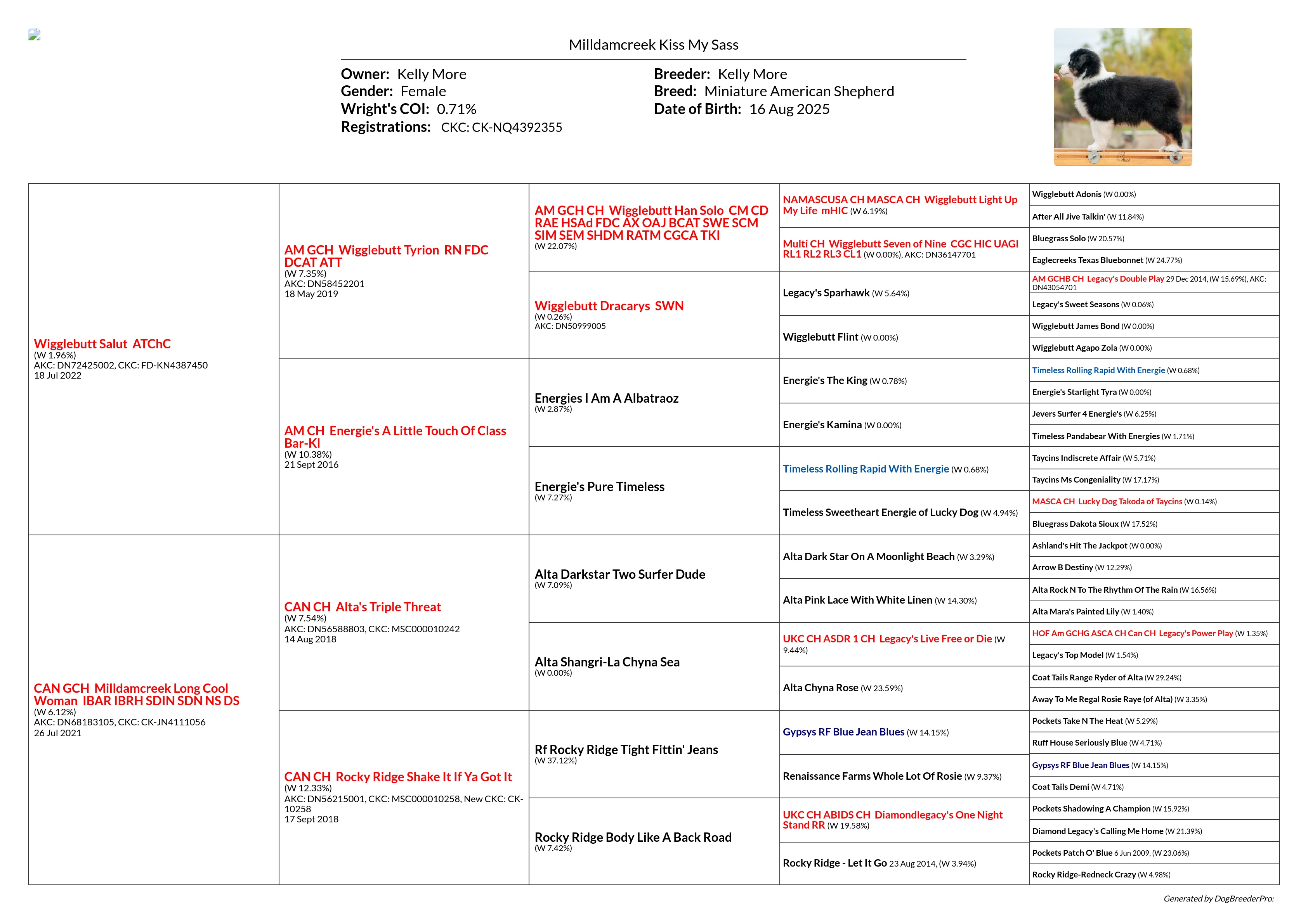 D.O.B: 08.16.2025 Sire: Wigglebutt Salut ATChC (Salut Info) Dam: 🇨🇦GCH Milldamcreek Long Cool Woman NS SDIN SDN IBAR IBRH DS Colour: Black Tri Eyes: Brown Height: n/a Weight: 5lbs at 8 weeks Hips: Too young Elbows: Too young Patellas: Too young CAER (eyes): Normal W/BO 10/2025 CEA: Clear via parentage CD: Clear via parentage DM: Clear via parentage HC: Clear via parentage HUU: Clear via parentage MDR1: Clear via parentage CMR1: Clear via parentage NCL: Clear via parentage PRCD: Clear via parentage CDDY: Possible Carrier, to be tested NAD: Clear via parentage None yet! |